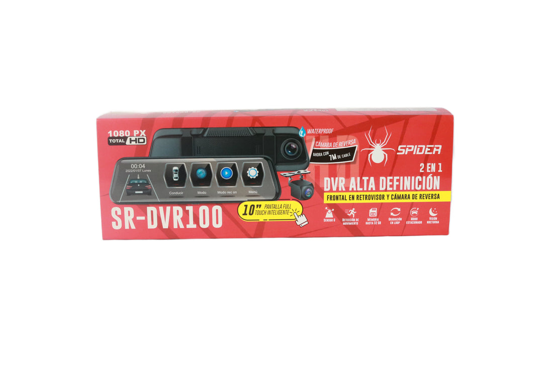El Spider SR-DVR100 es un DVR 2 en 1 que integra cámara frontal en el retrovisor y cámara de reversa, ideal para mejorar la seguridad, el control y el registro de tu manejo diario. Su diseño moderno y pantalla táctil lo convierten en una solución práctica y completa para cualquier vehículo.